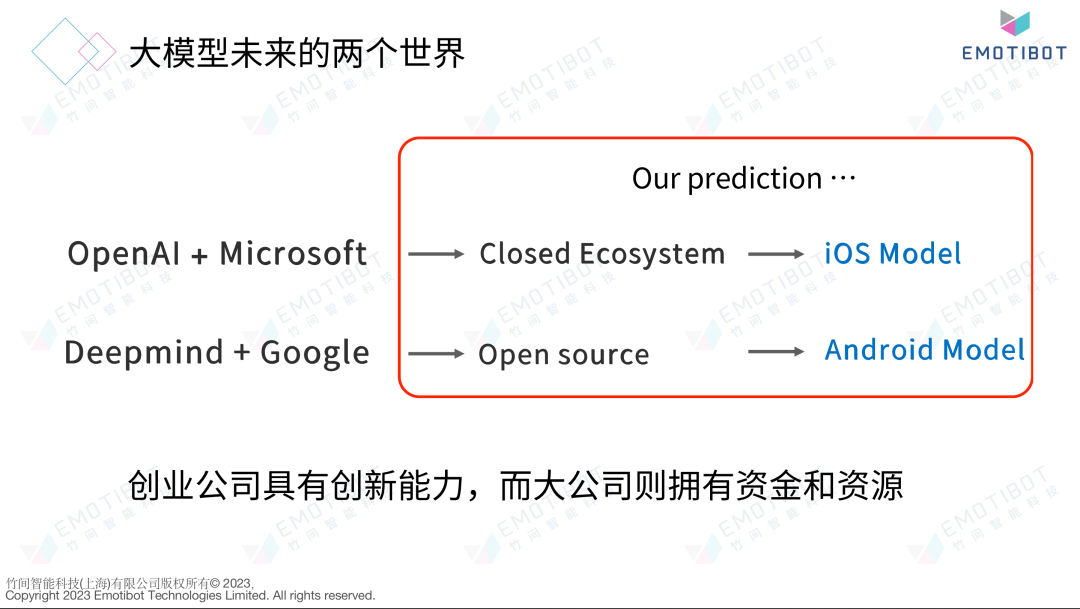 在ChatGPT和GPT-4掀起人工智能革命的当下,人们对未来生态的演变产生了极大兴趣。如何抓住ChatGPT带来的红利成为关注的焦点。简仁贤认为,ChatGPT将成为通用人工智能的操作系统。同时,大型语言模型也将分裂为“两个世界”,一个由OpenAI和微软主导的闭源世界,另一个由Deepmind和Google主导的开源世界。他表示,中国的创业公司将成为开源模型的最大受益者,因为相较于互联网巨头,小公司具有更大的创新能力。然而,大公司拥有更多的资源和资本,因此创业公司和大公司之间的结合将使得创新更加规模化。总之,未来的生态将不断演变,对于那些抓住ChatGPT带来的机遇的公司而言,将迎来无限的开展潜力。